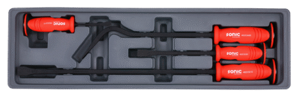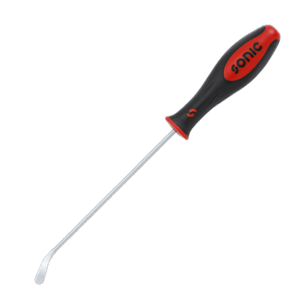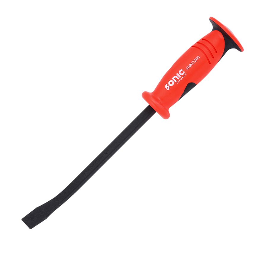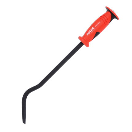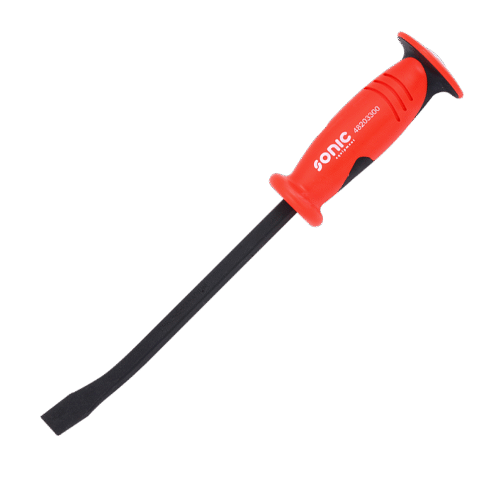 The Sonic 12-inch pry bar is built with heavy-duty in mind. A square beam of hardened steel protrudes from the handle and slightly bends toward the tip. After the bend, the square steel begins to flatten, creating a wedge shape which is excellent for prying and applying extreme forces. The plastic handle forms comfortably to your hand and a ring around each end of the handle helps to protect the user’s hand. Covered by our lifetime warranty.