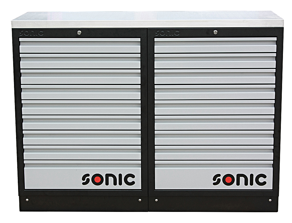 This self-supporting MSS system creates the best work space by keeping everything organized and efficient. It is equipped with 18 drawers for ultimate storage needs. It includes front centralized locks on drawers to keep all your tools and materials safe and secure. It features a stainless steel top blade for added work space and is compatible with Sonic Foam Systems (SFS).