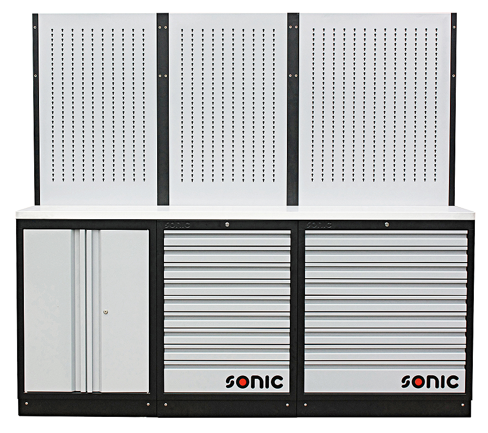 This MSS System creates the best work space by keeping your work area clean and organized. It is equipped with 18 drawers and a closet for maximum storage. It has a stainless-steel top blade for added work space. It is compatible with Sonic Foam Systems (SFS) and is a self-supporting structure. It features a hanger board to hang tools and materials from. This brings organization and efficiency to a whole new level.