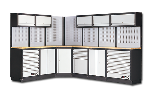 Shop our Modular Storage Systems to maximize workflow, featuring 22 total drawers, over head cuboards, 3 storage cabinets, and corner cabinets